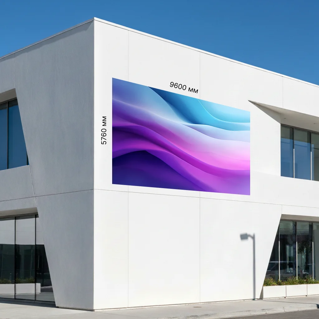 Светодиодный экран 9600 х 5760 мм (Р 8) предназначен для размещения на больших фасадах, где особенно важна высокая заметность бренда и рекламных сообщений. Яркость 5500 кд/м² и широкие углы обзора 160° по горизонтали и 120° по вертикали позволяют сохранять чёткое и контрастное изображение днём, в пасмурную погоду и в условиях плотного городского трафика.