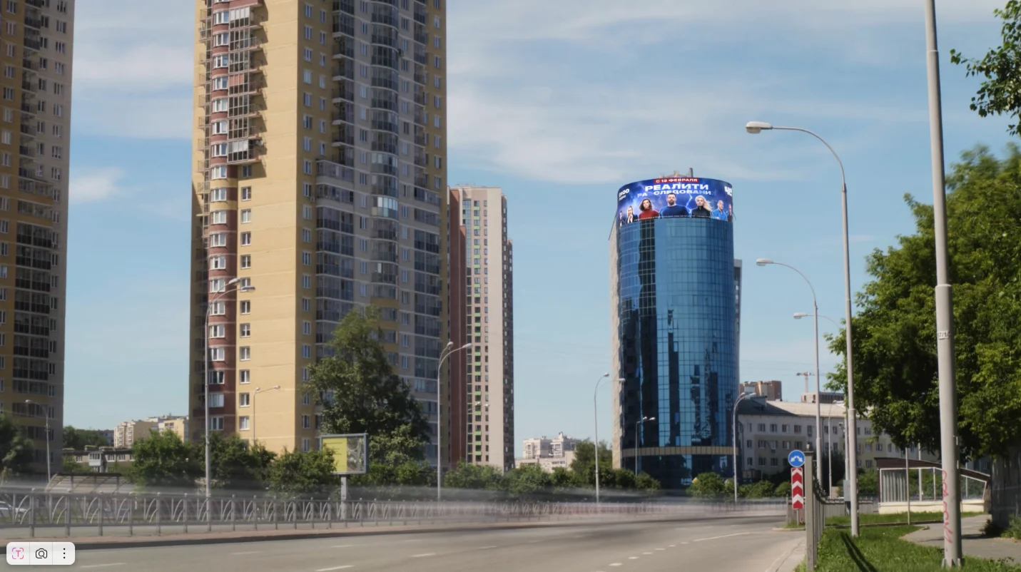 Экран служит ярким акцентом фасада и рекламной платформой для арендаторов и партнёров бизнес-центра.