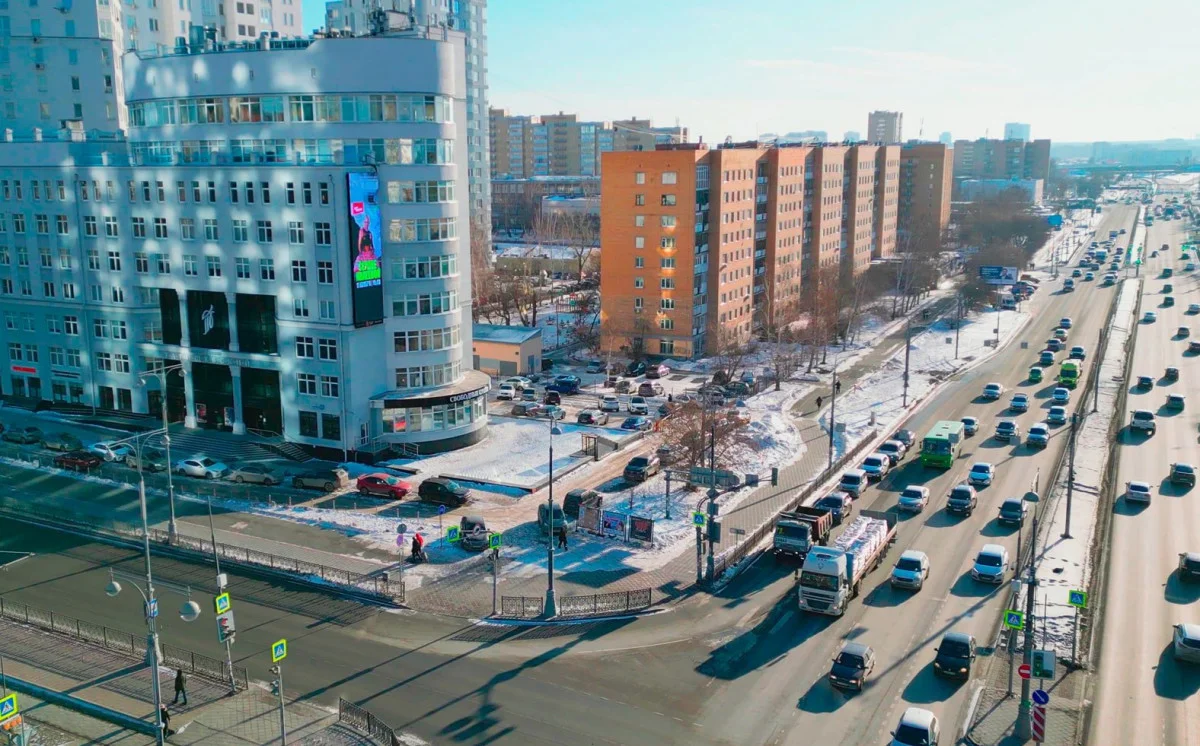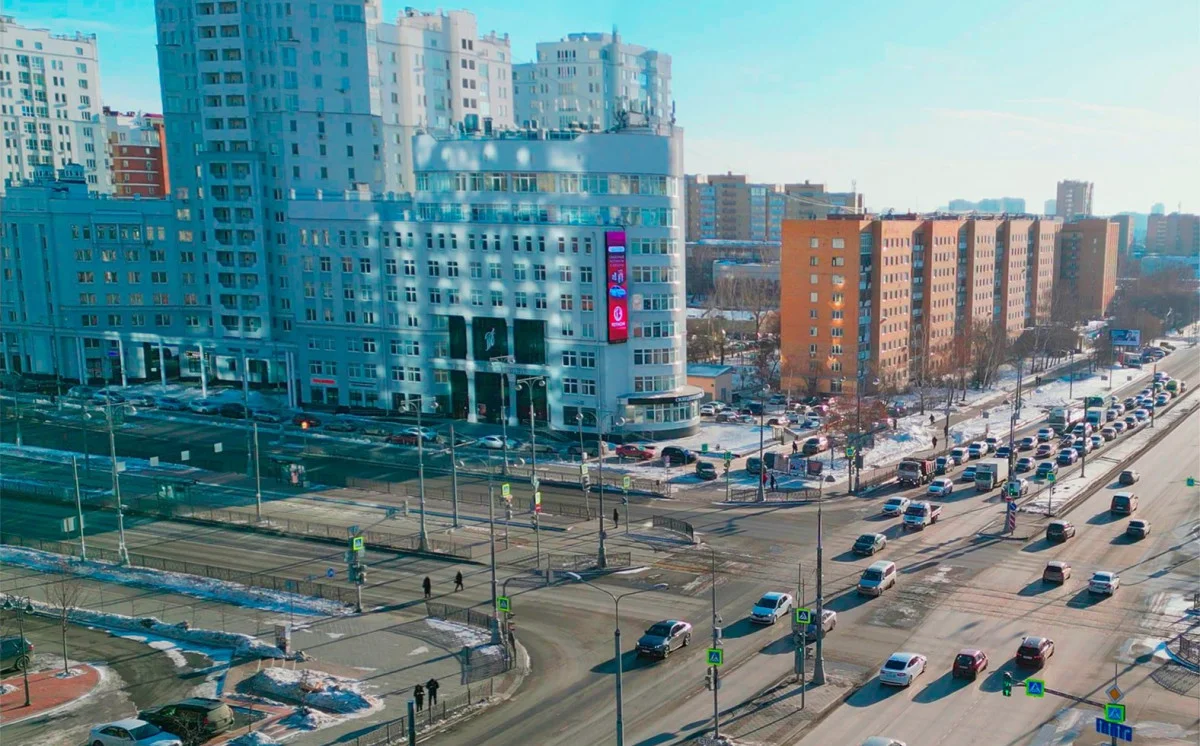 Экран размещён вертикально, что делает его особенно эффективным для визуальной навигации и брендирования. Его видно с большой дистанции, и он органично дополняет архитектуру бизнес-центра.