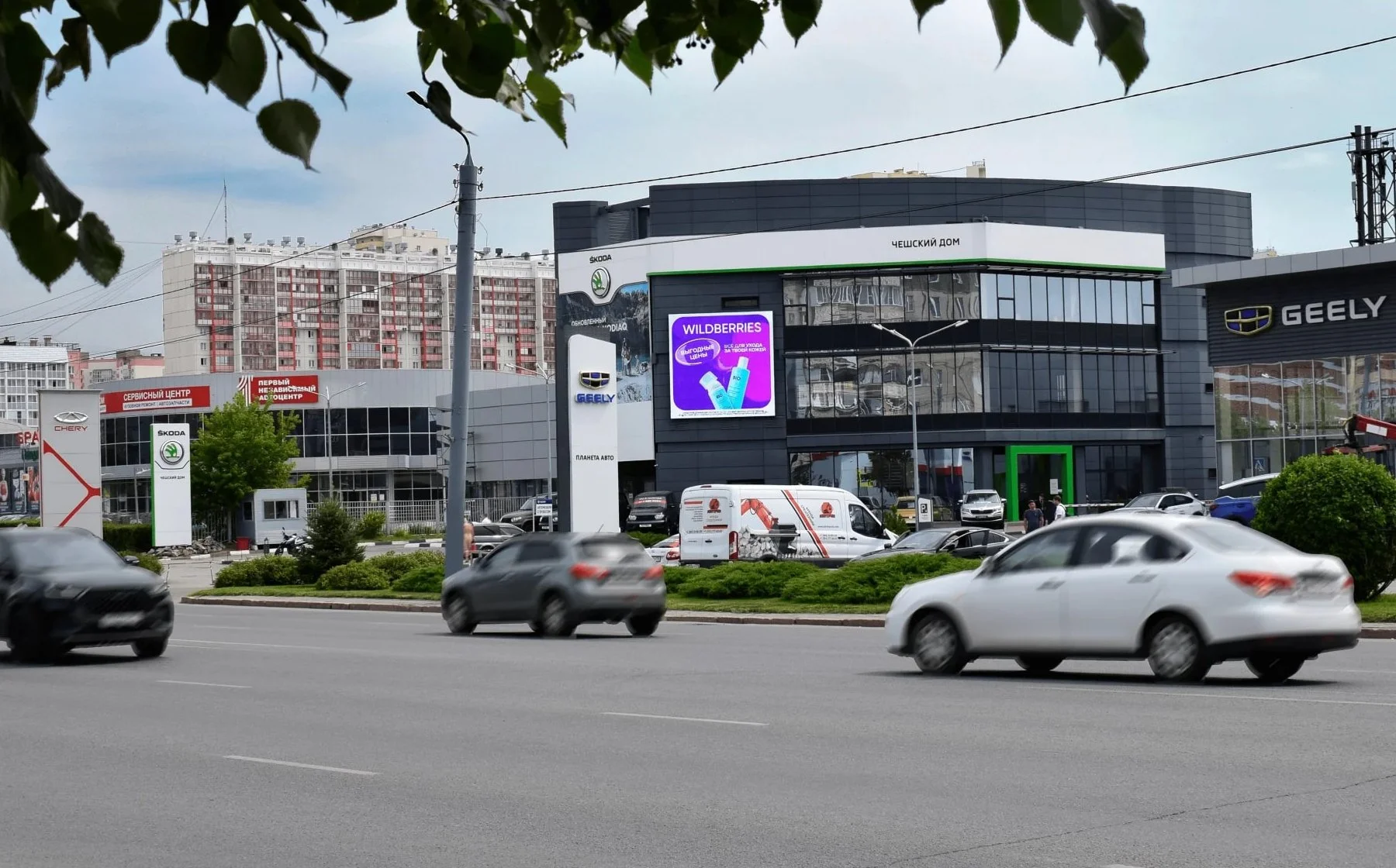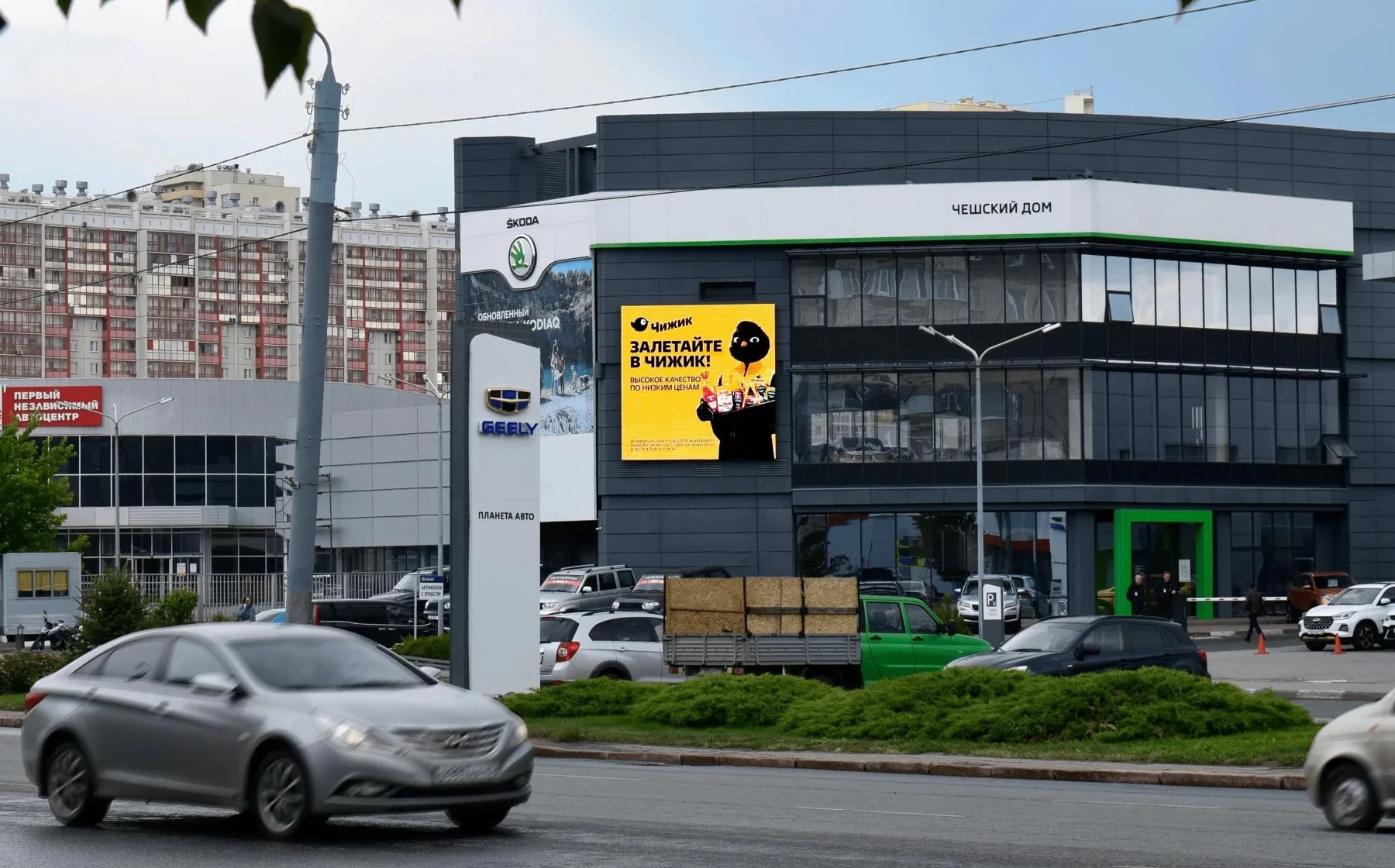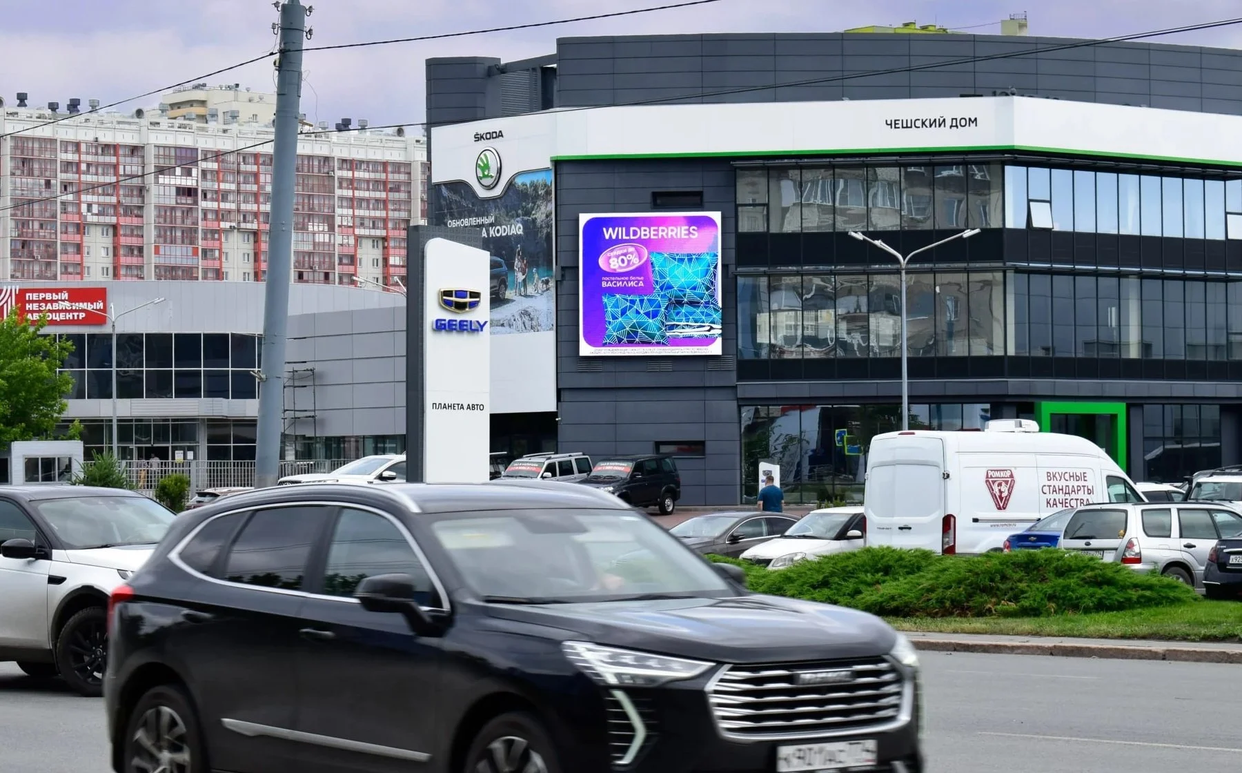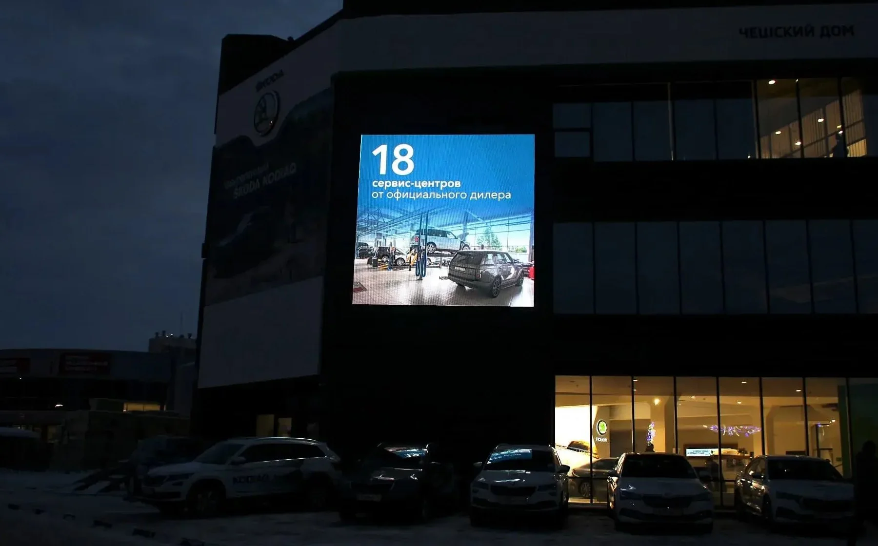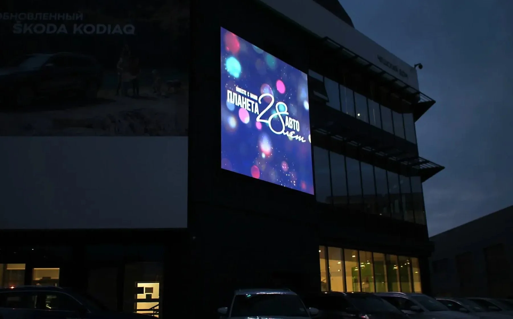 Запросы: видеоэкран для Škoda, экран на автоцентр, медиафасад с презентацией автомобилей.