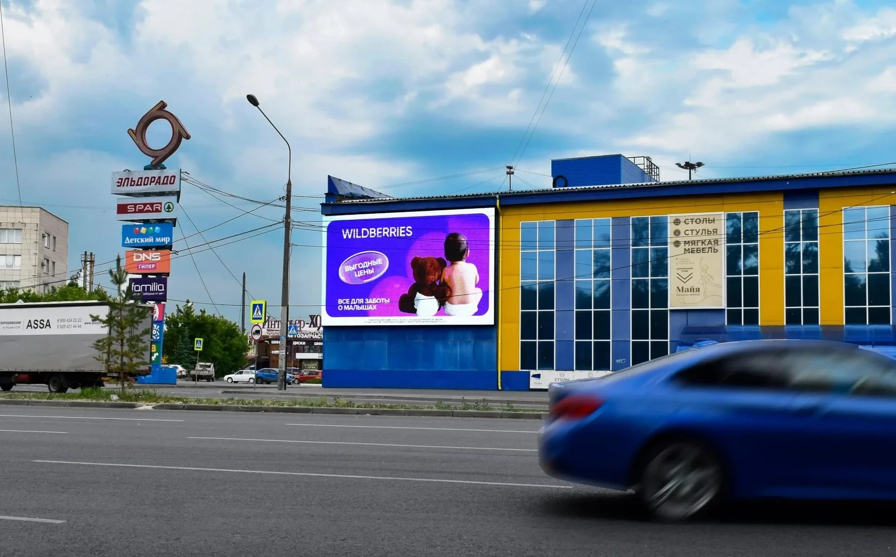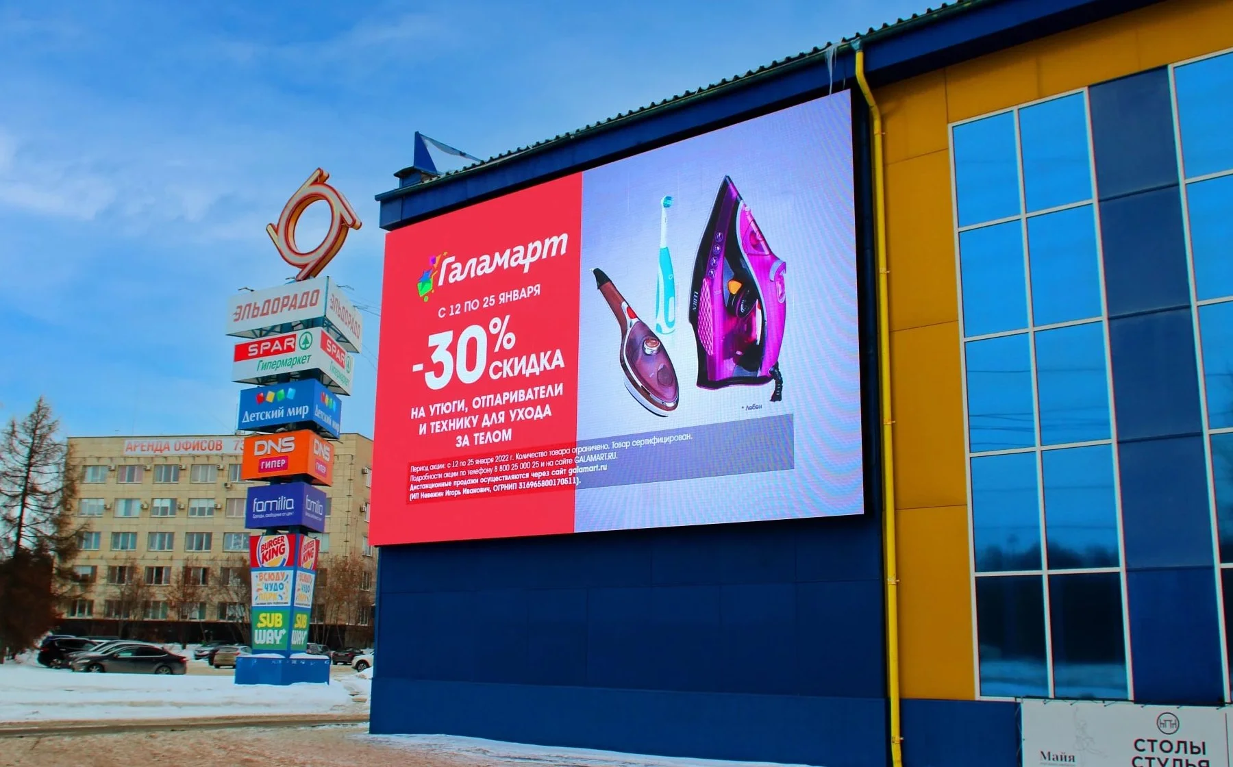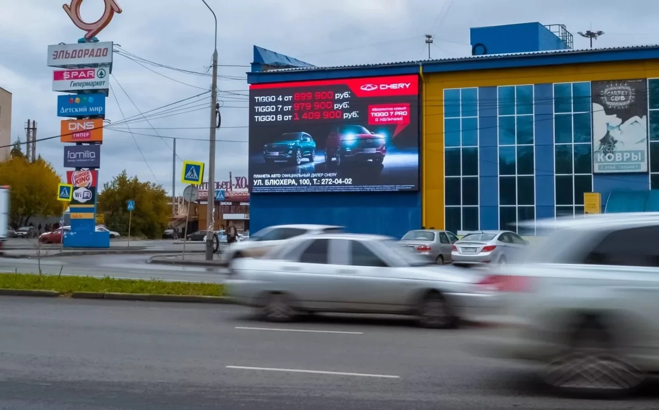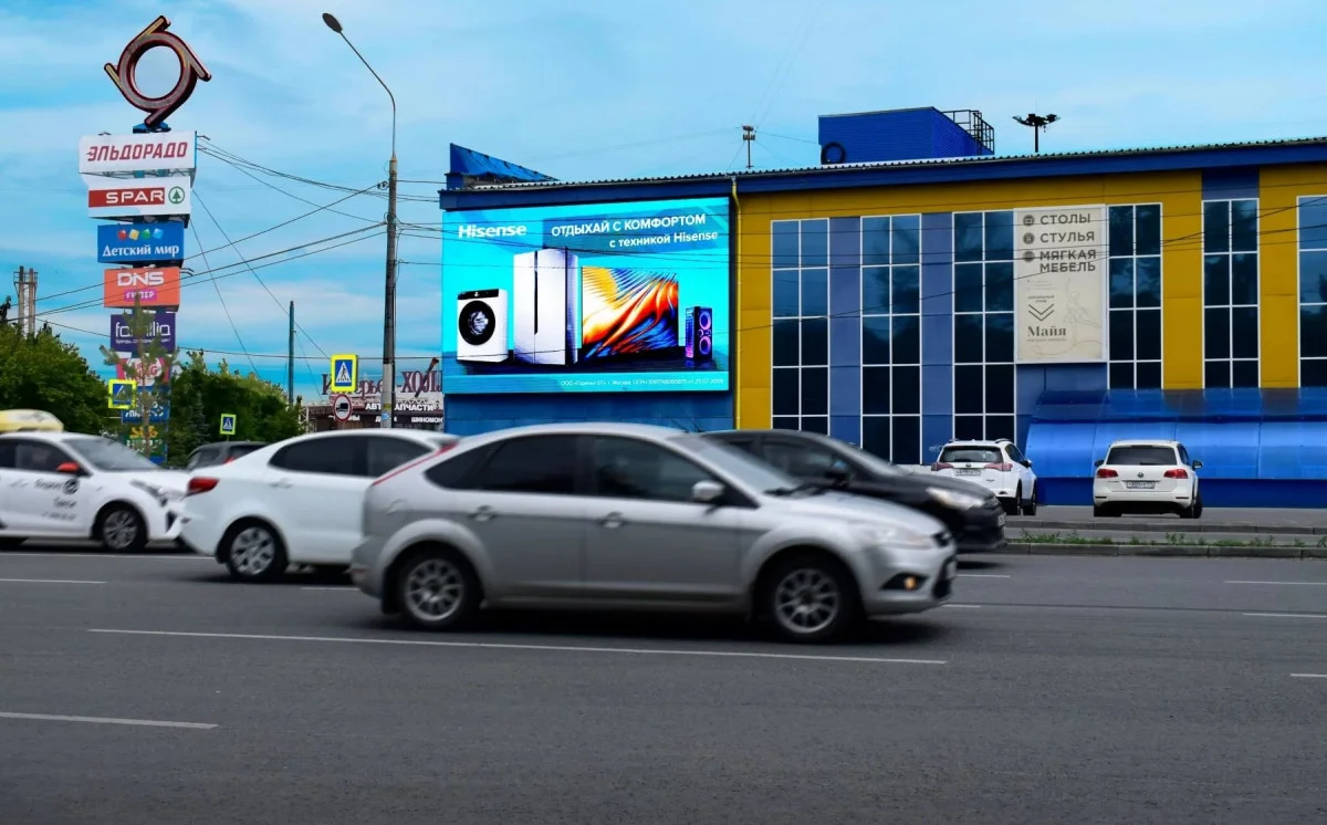 Экран размещён на фасаде популярного торгового комплекса и используется для продвижения как внутренних арендаторов, так и внешних рекламодателей.