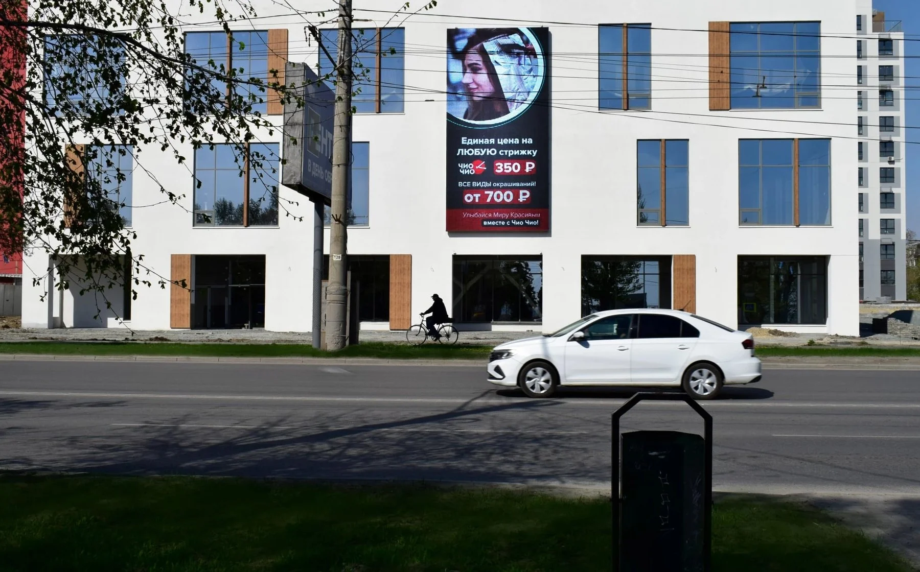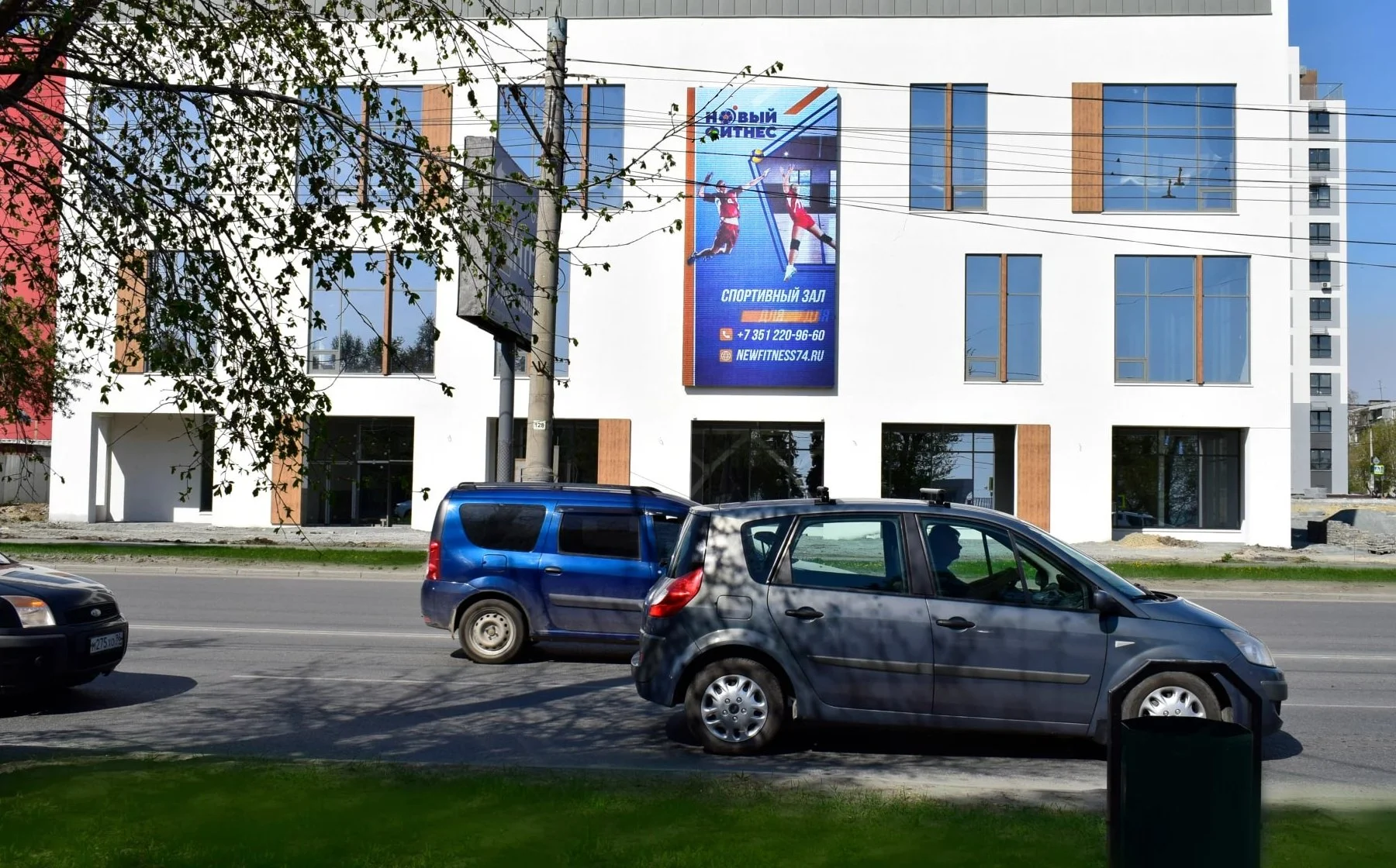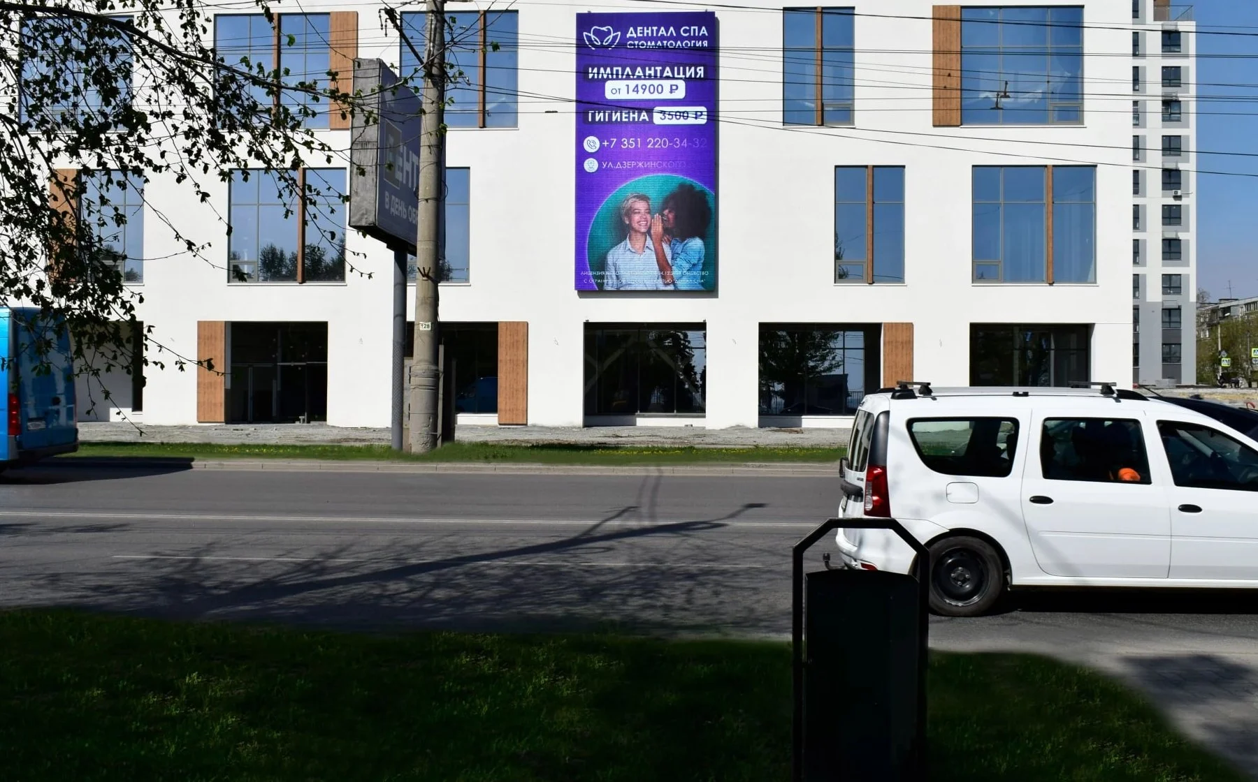 Видеоэкран расположен в Ленинском районе, на одной из самых длинных улиц города - ул. Новороссийская, рядом располагается озеро Смолино. Видеоэкран установлен на административном здании на ул. Новороссийская. Неоспоримым преимуществом видеоэкрана является то, что он расположен на самой длинной улице города, где большой поток транспорта и пешеходов. Вблизи него расположены: жилой квартал MOTIVE, дворец культуры ЧТПЗ, коммерческие и промышленные предприятия, а также городской пляж Восход. Высокие транспортные и пешеходные потоки, светофоры.