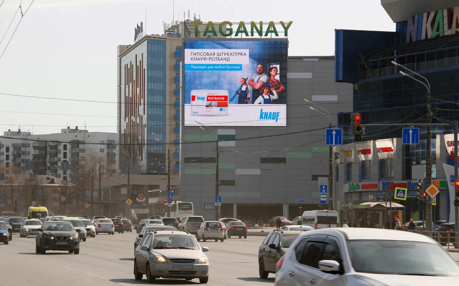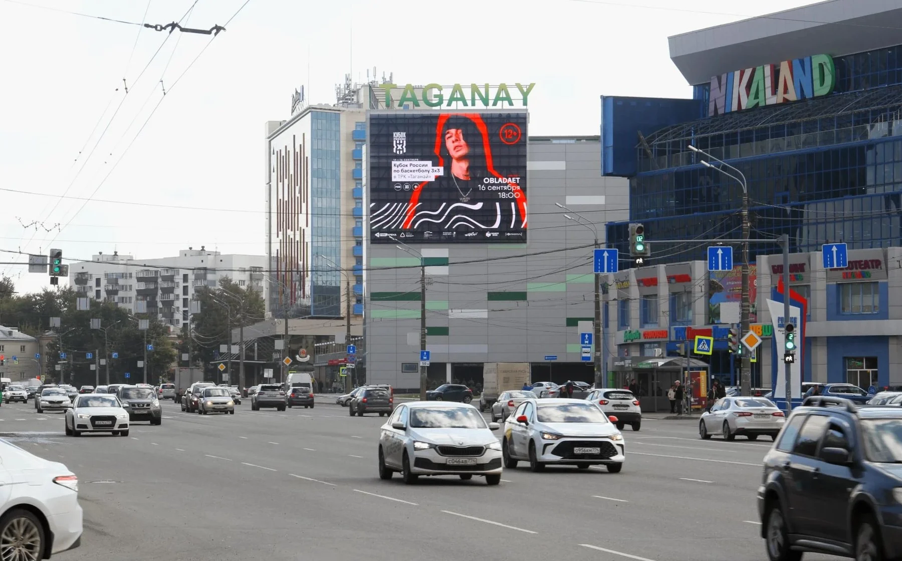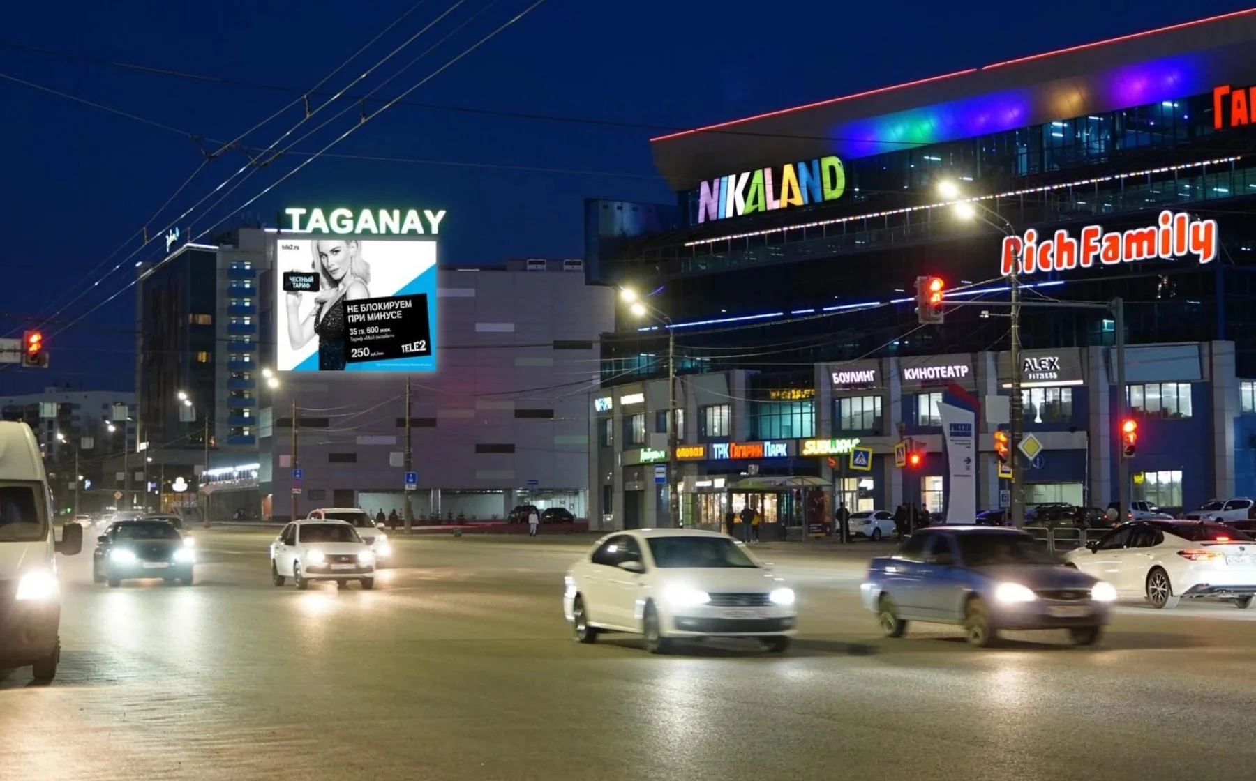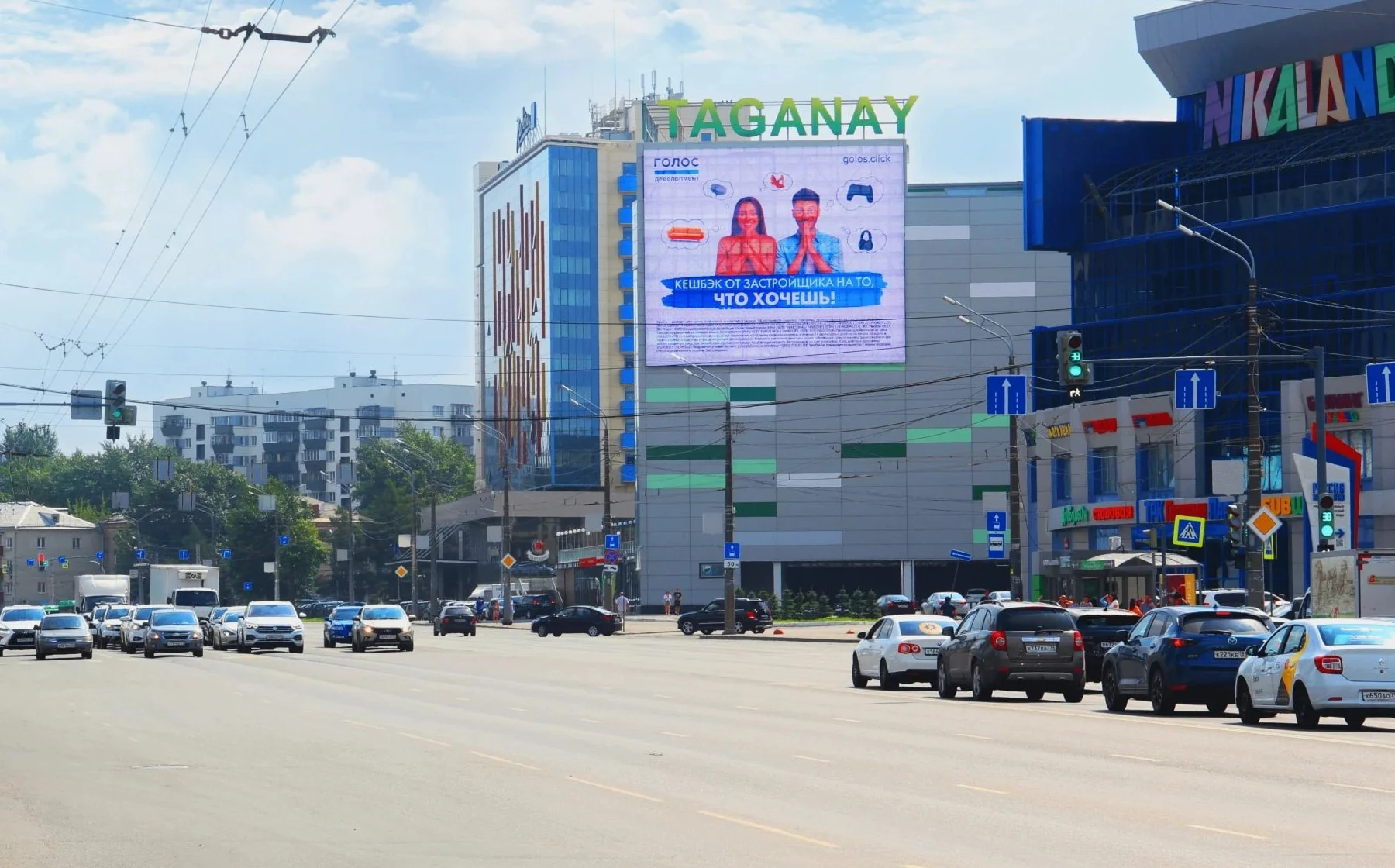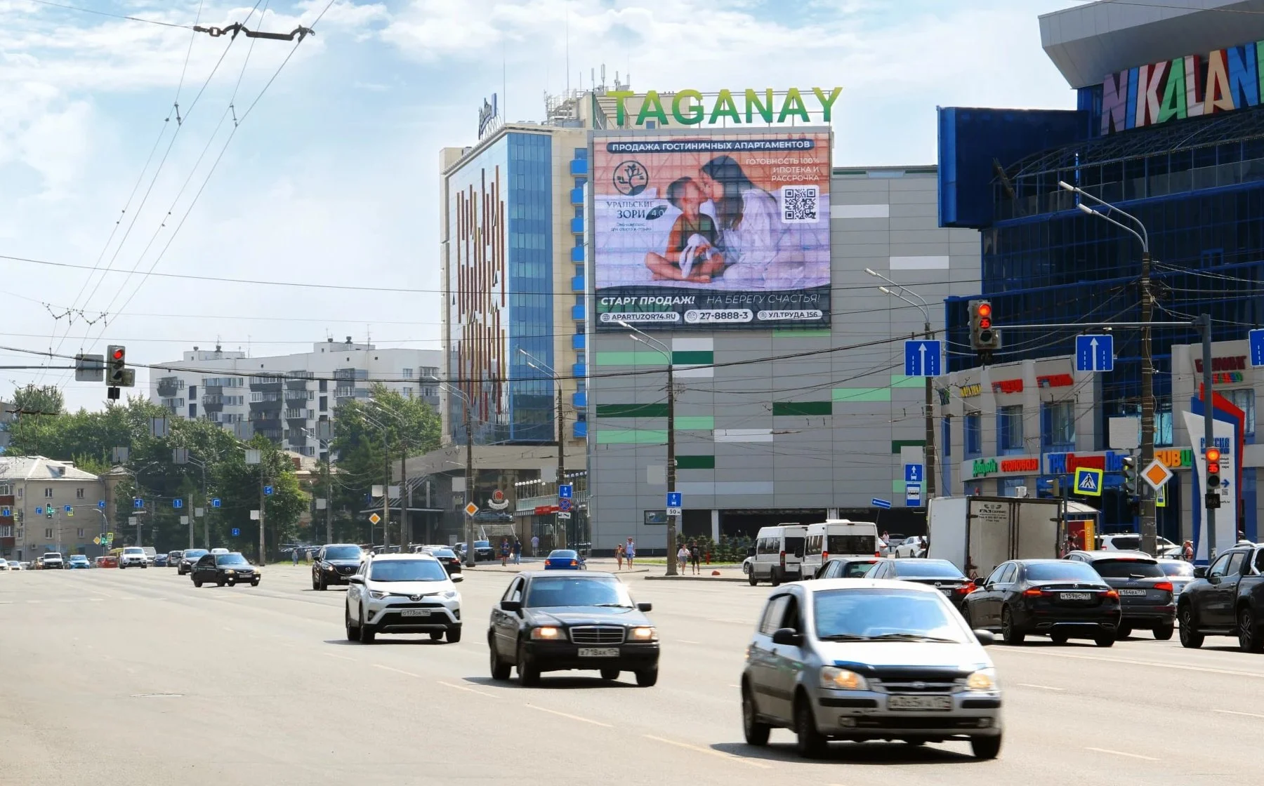 Экран впечатляет размерами и яркостью, отлично виден с разных точек ул. Труда. Установлен на фасаде крупного ТРК, он стал настоящим ориентиром и визуальной доминантой.