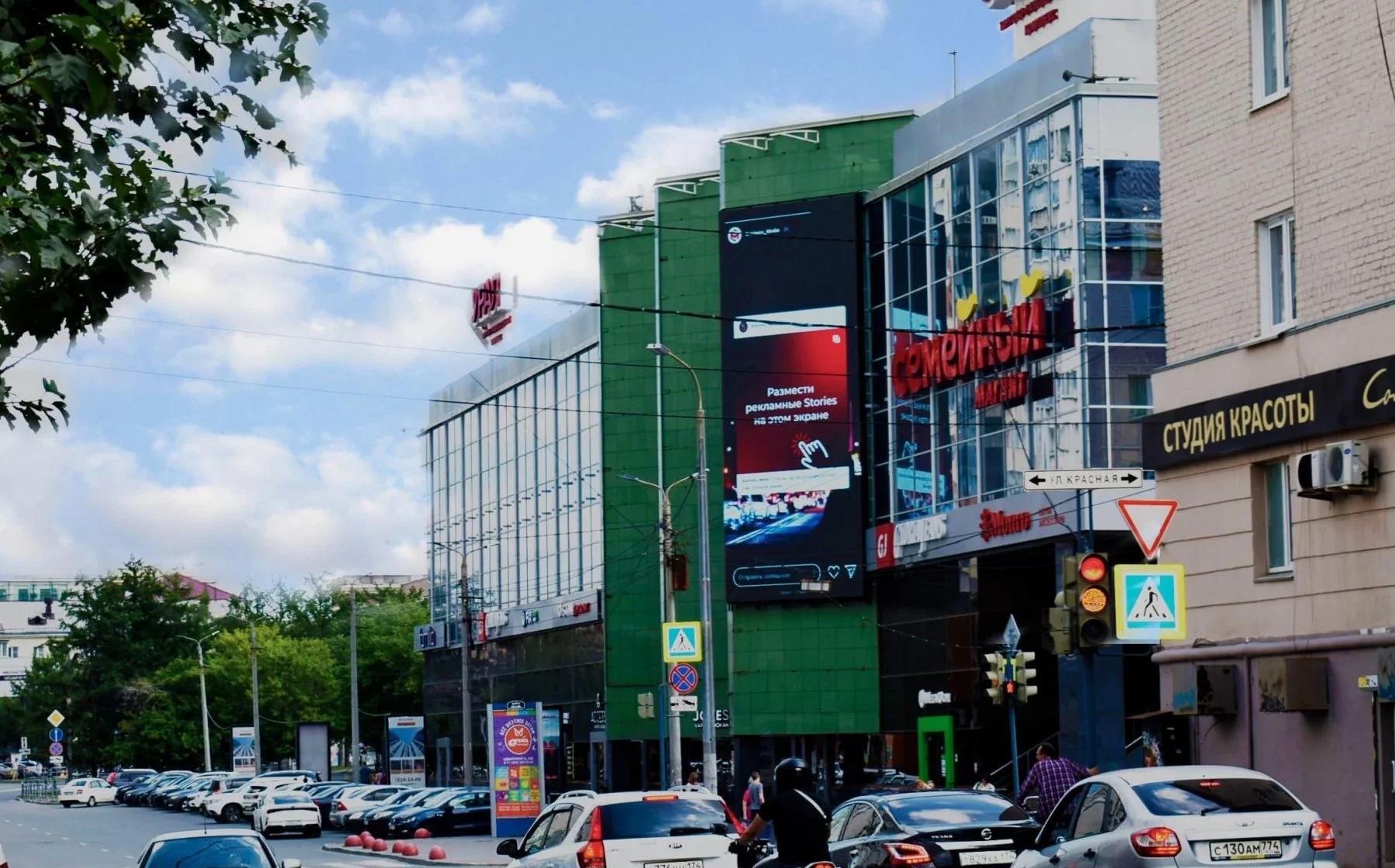 Данный экран отлично вписывается в архитектурный облик ТРК. Это первый установленный в городе вертикальный экран с шагом пикселя 8 мм, отлично просматривается как пешеходным трафиком с тротуара, так и автомобилям с дороги.